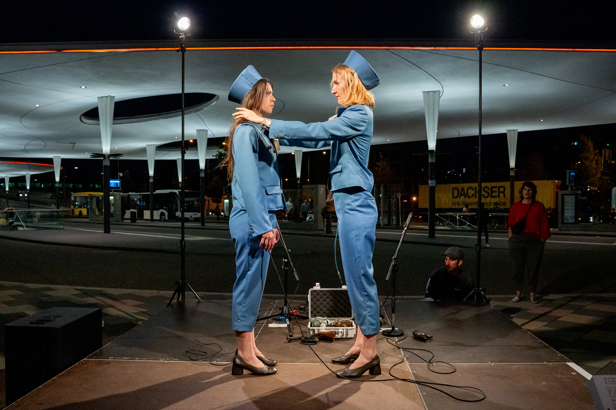 For just one night, the central bus station is transformed into an airport runway. Witness two unemployed air hostesses, as they embark on a thought-provoking journey, performed by artists Elise Ehry and Kitty Maria. Through clever references from the world of female service workers, they challenge the everyday norms we often overlook. Is the stereotypical image of classic female labour, defined by humility, submissiveness, and impractical uniforms, natural or imposed? To create the precise atmosphere they desire, Ehry and Maria crafted their own costumes and instruments especially for Gala HBF.