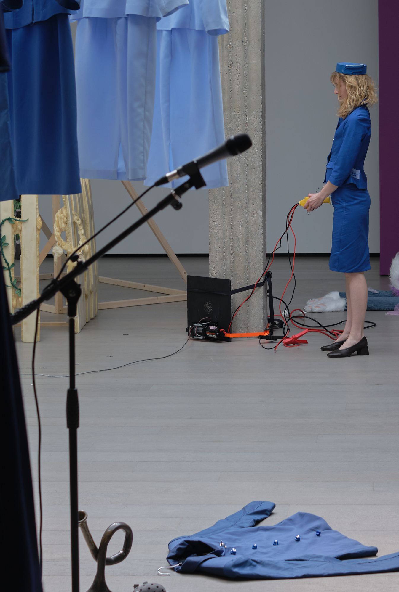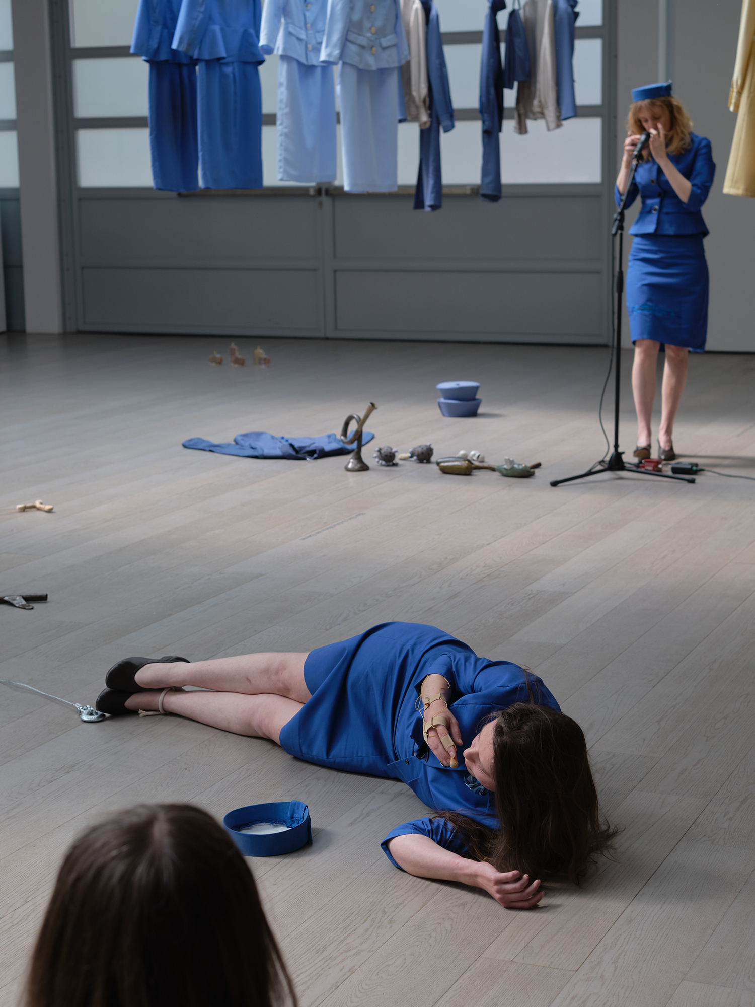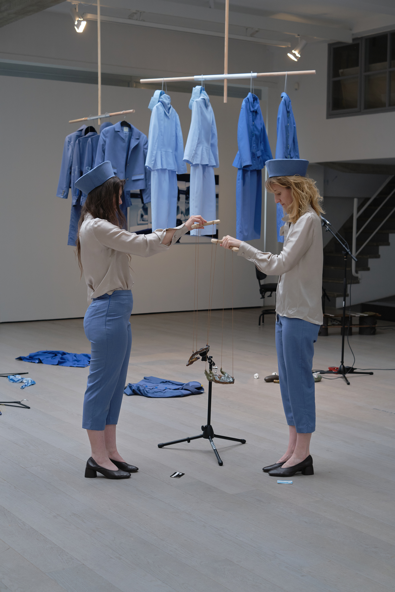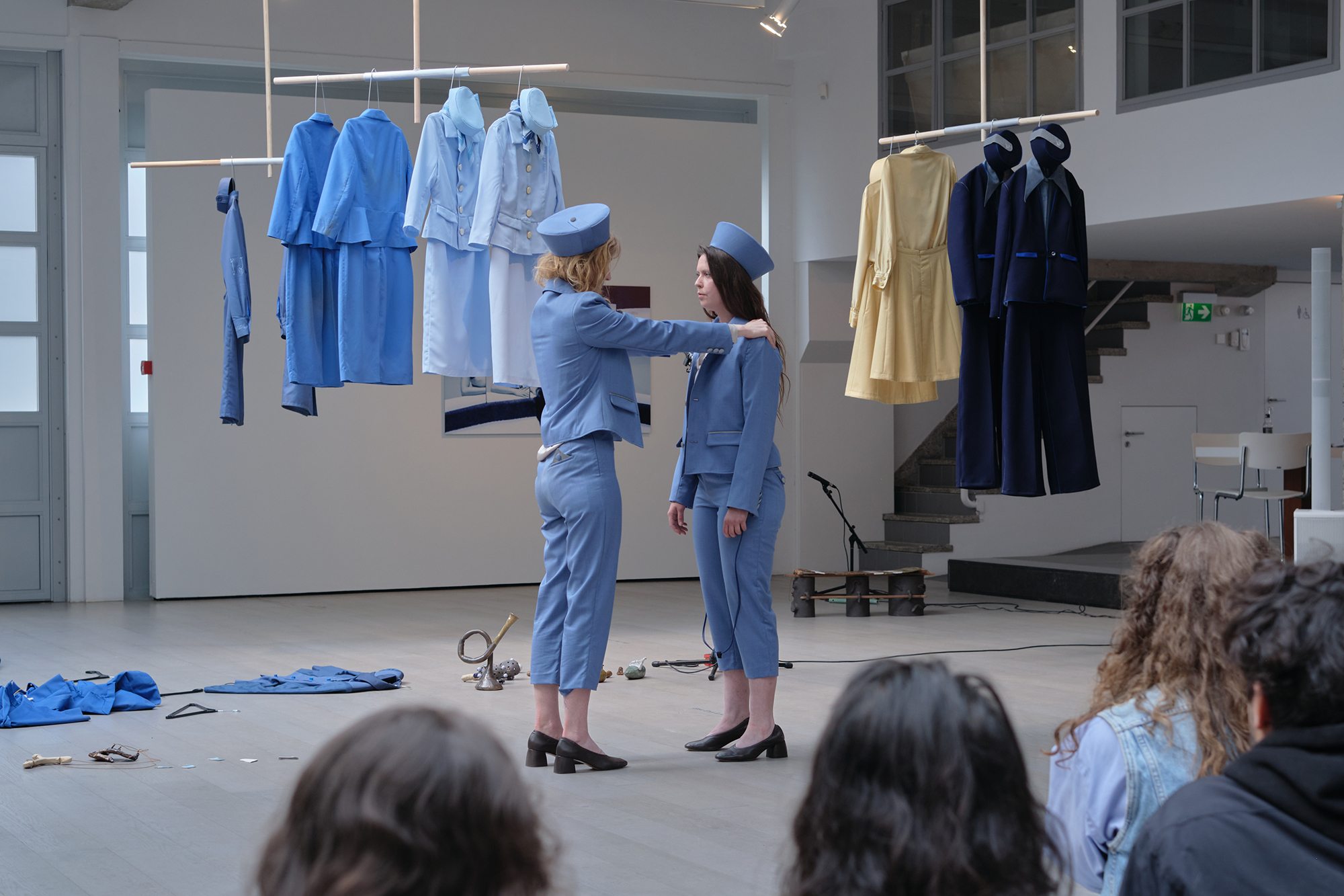 Performative activation of our installation that was made of 7 sets of air hostess uniforms and ceramic instruments at Garage Rotterdam, NL.