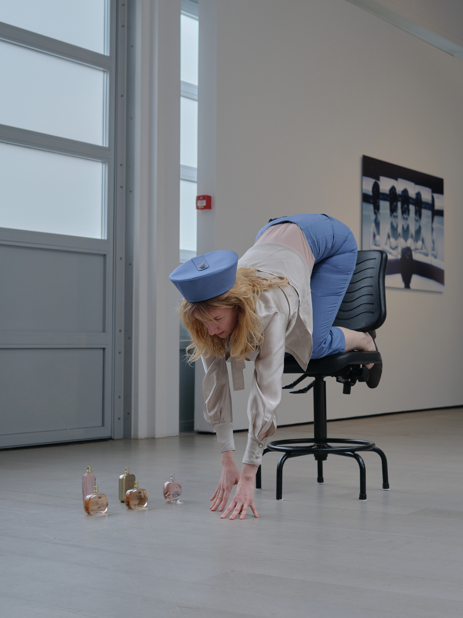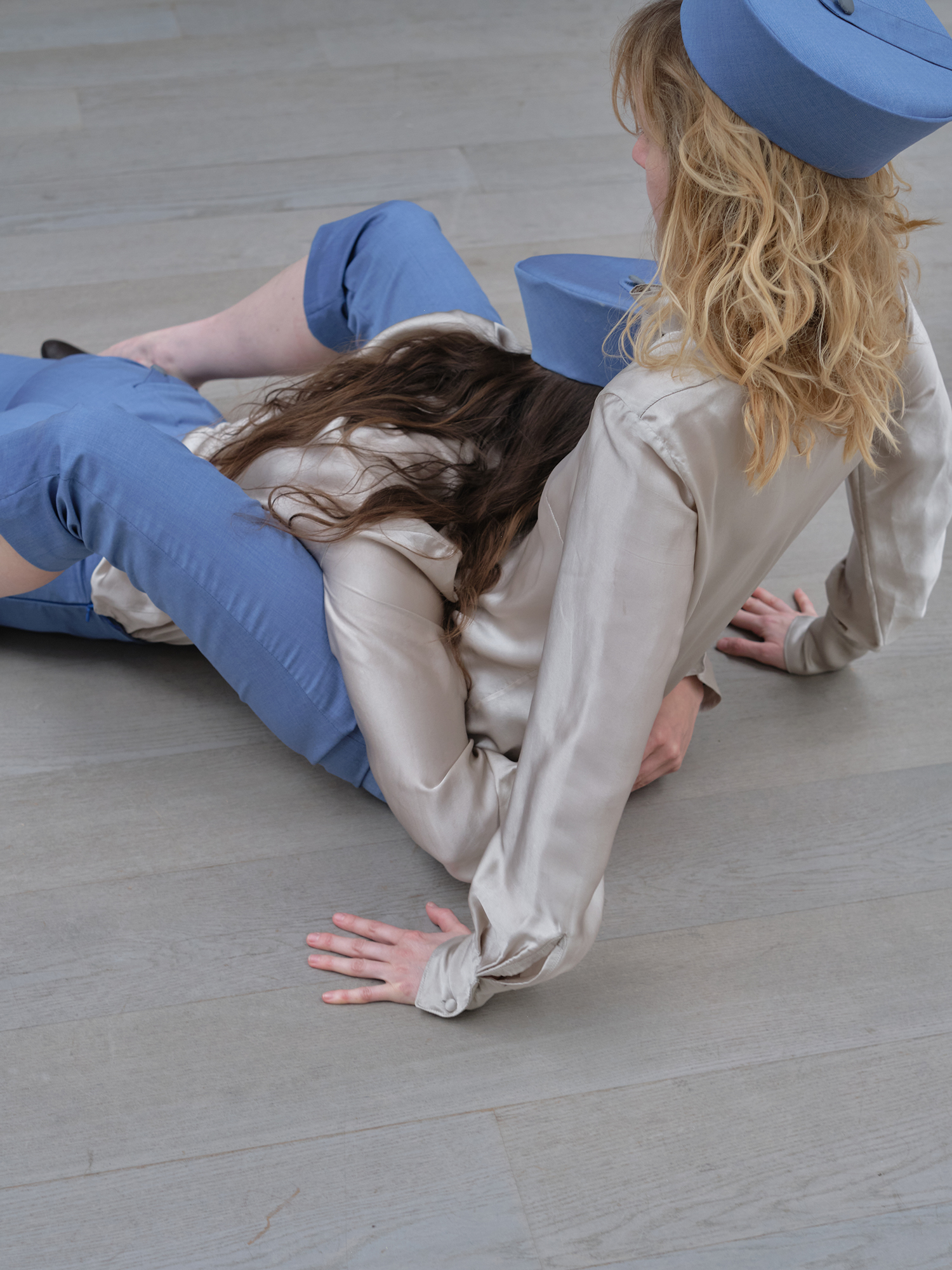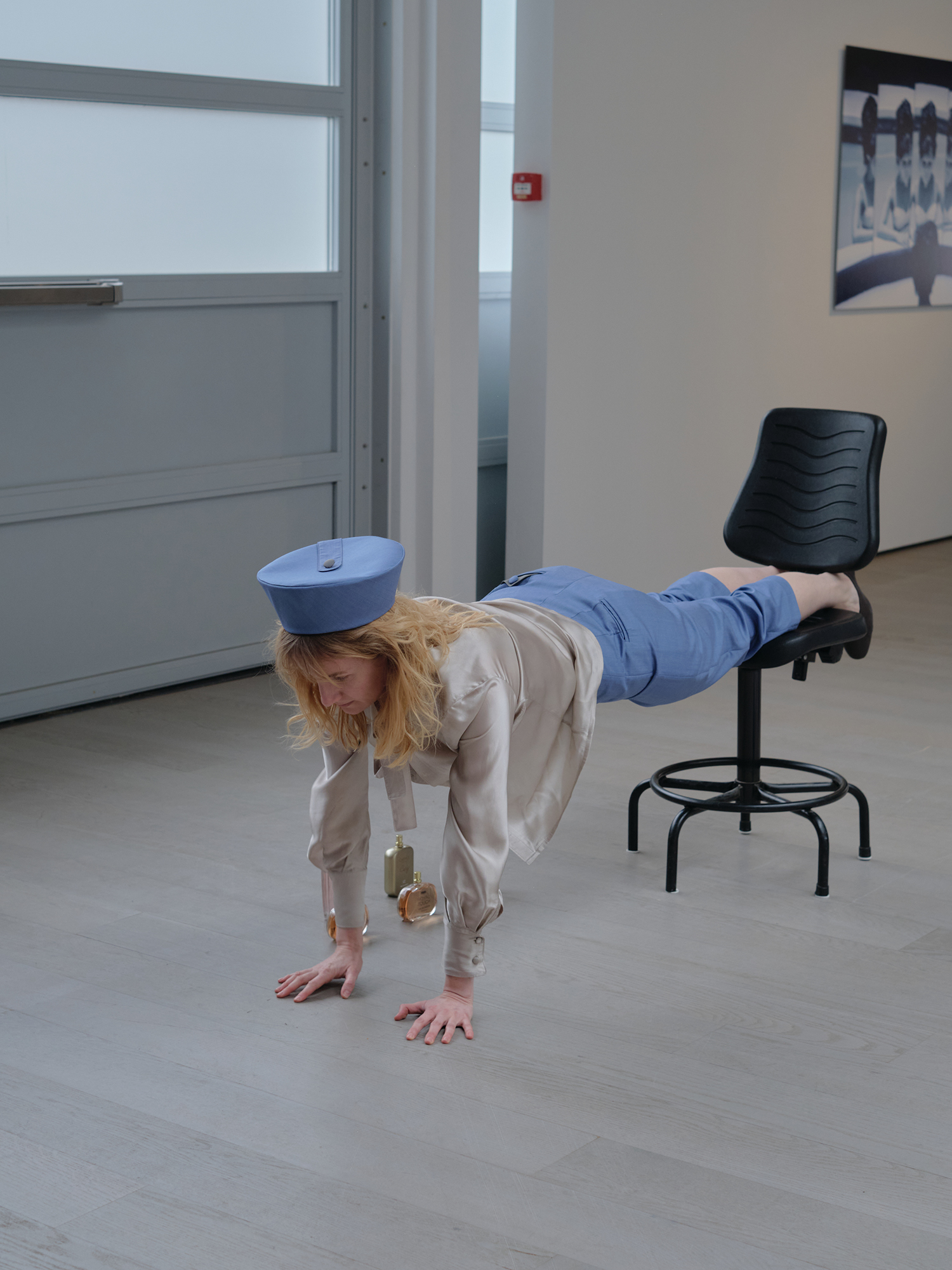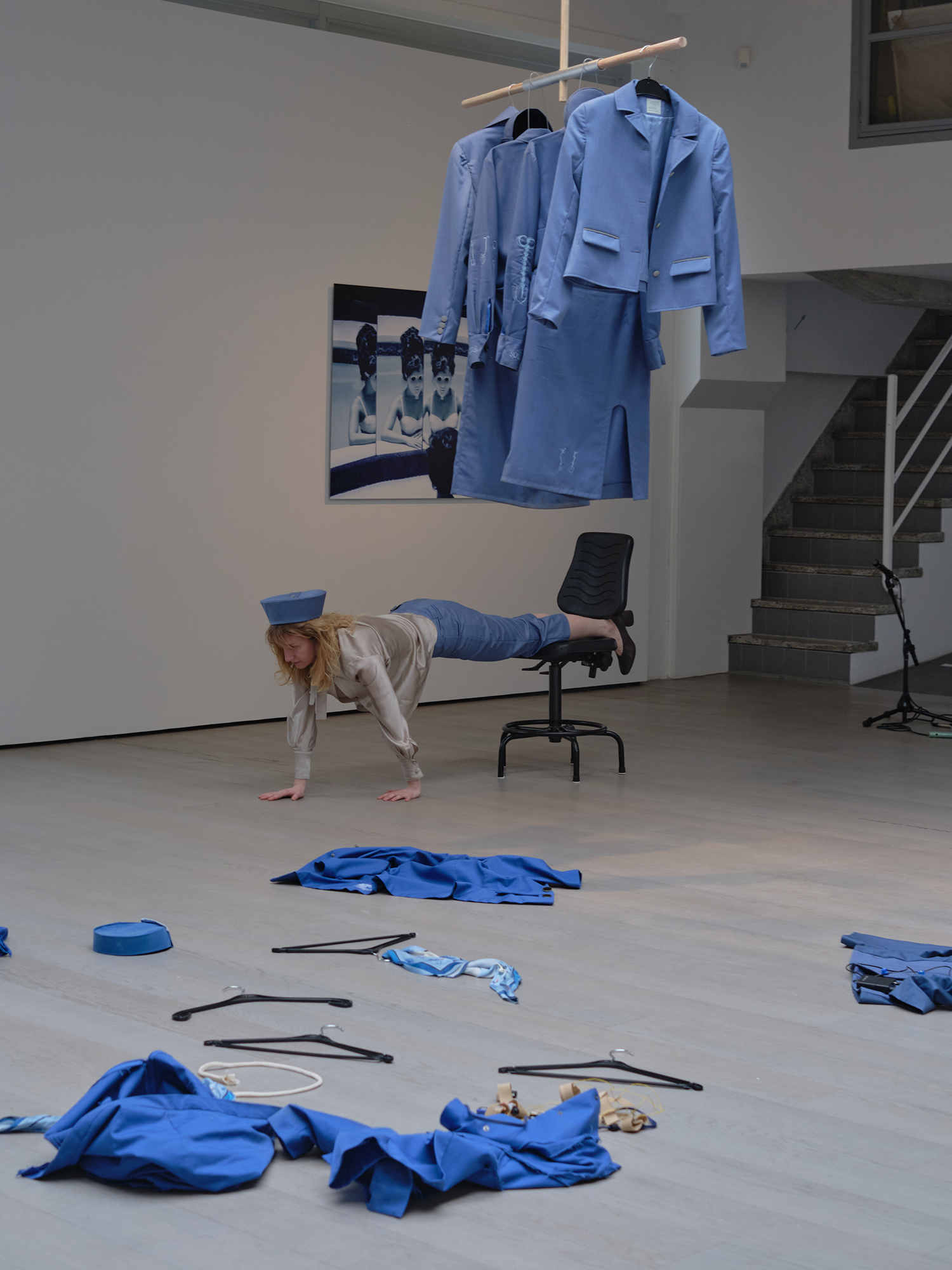 Performative activation of our installation that was made of 7 sets of air hostess uniforms and ceramic instruments at Garage Rotterdam, NL.