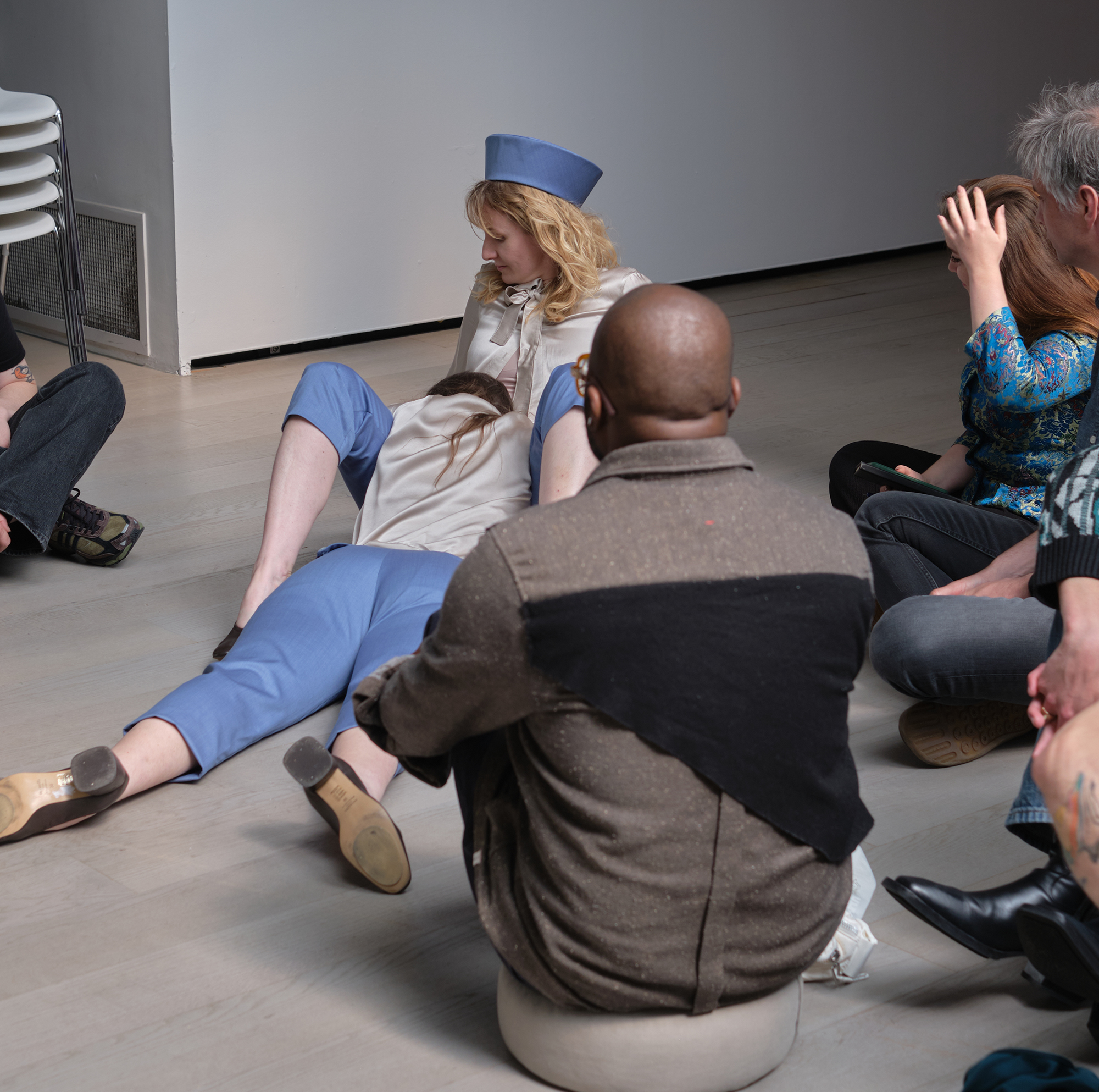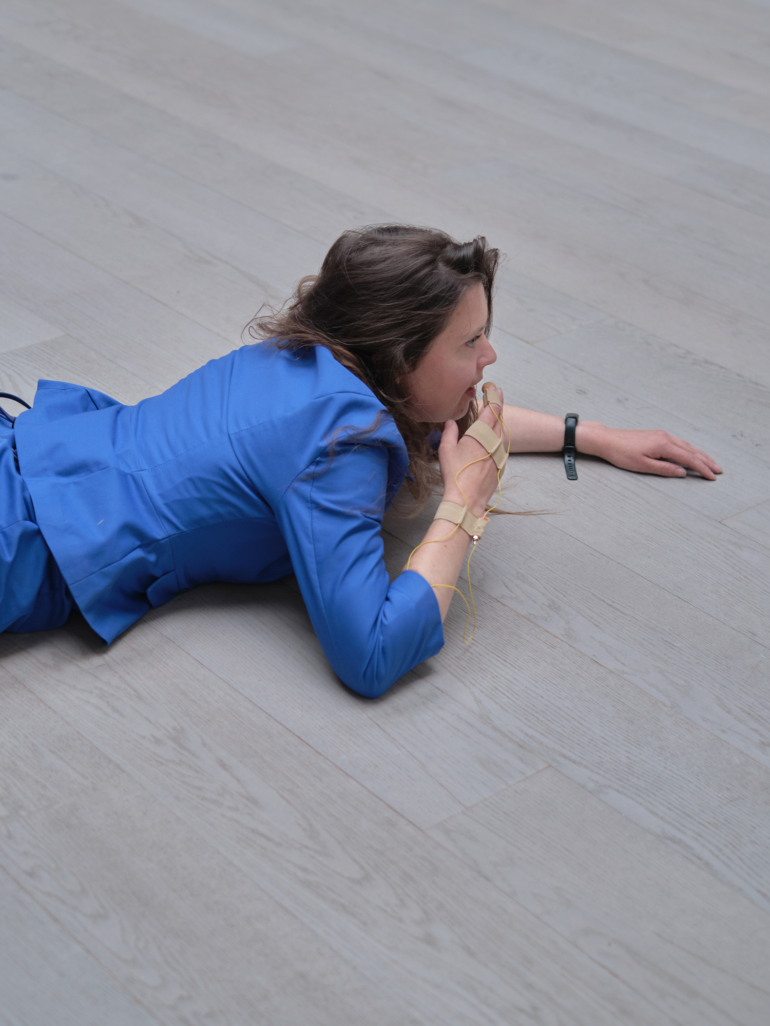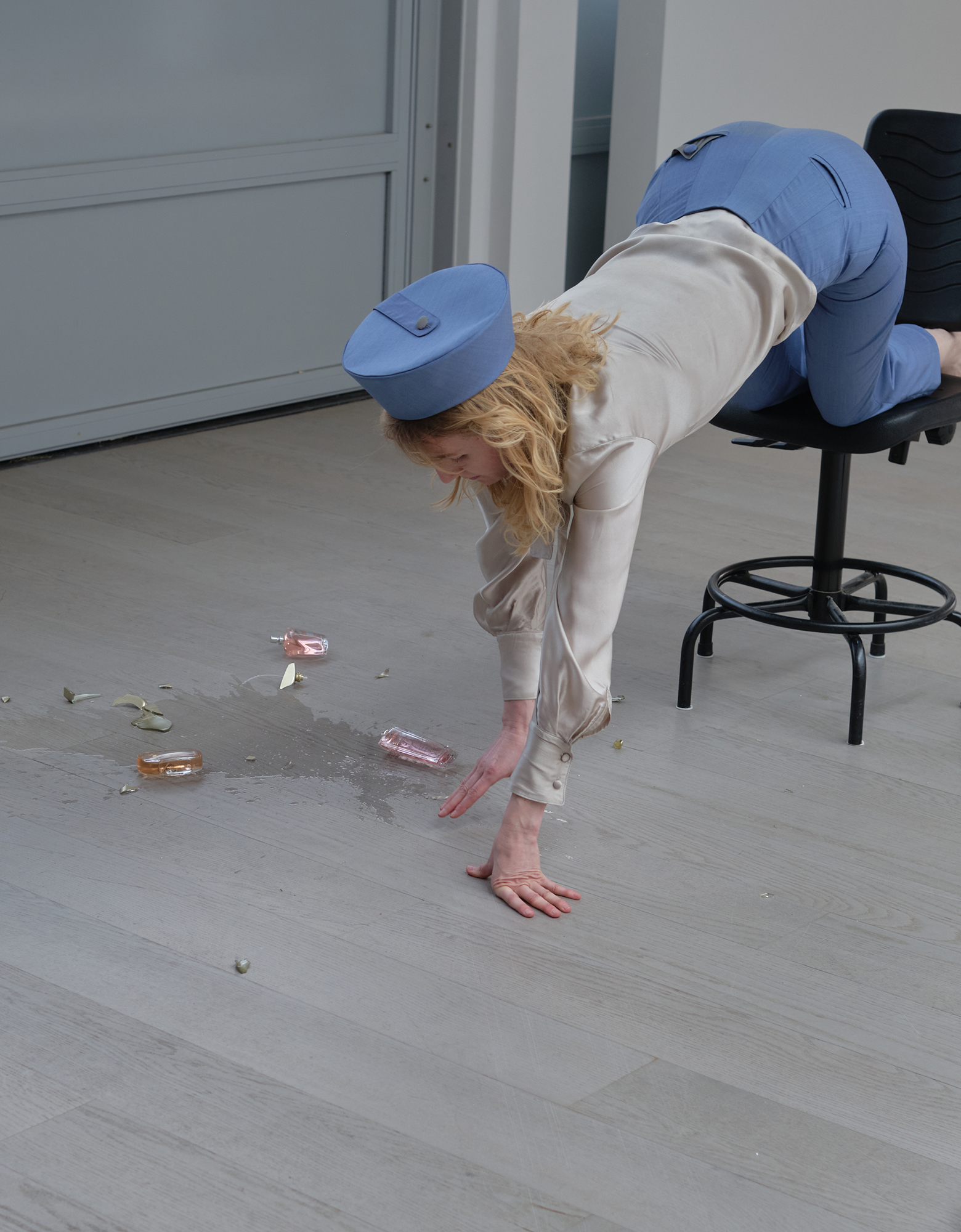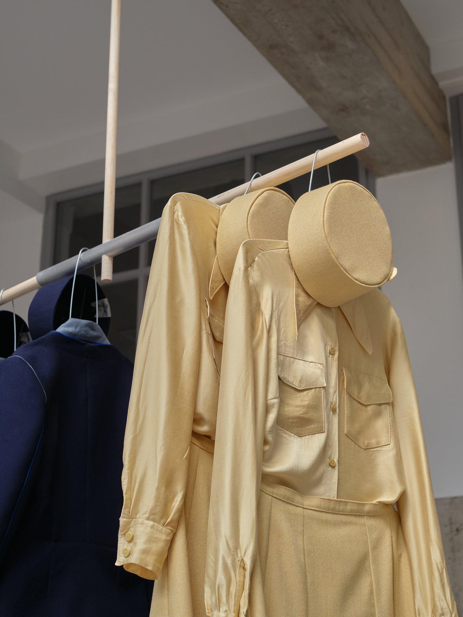 Performative activation of our installation that was made of 7 sets of air hostess uniforms and ceramic instruments at Garage Rotterdam, NL.