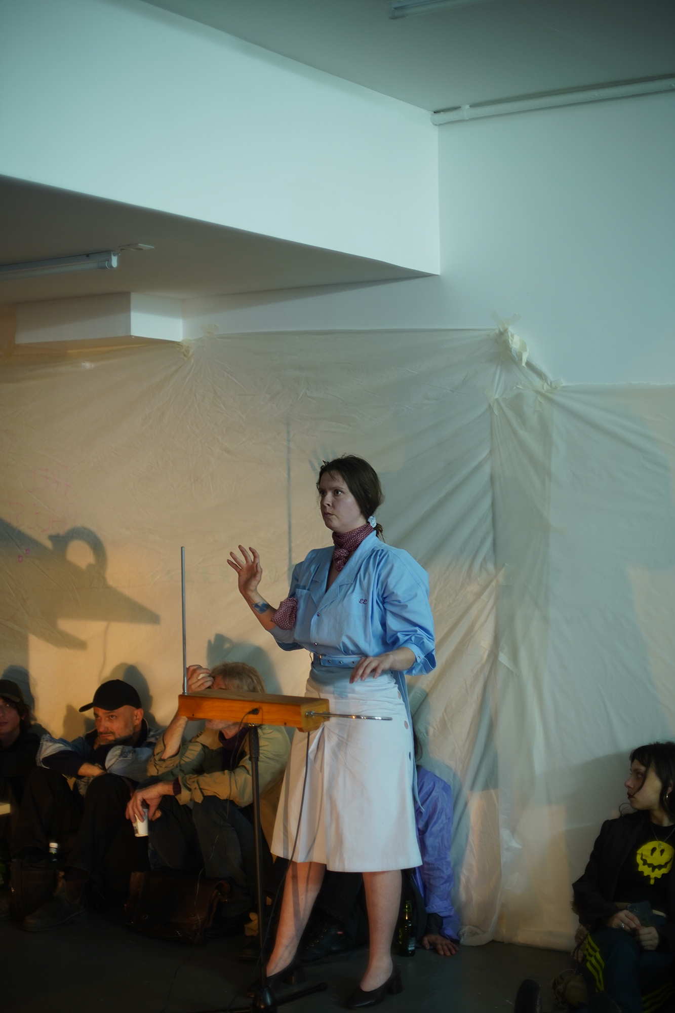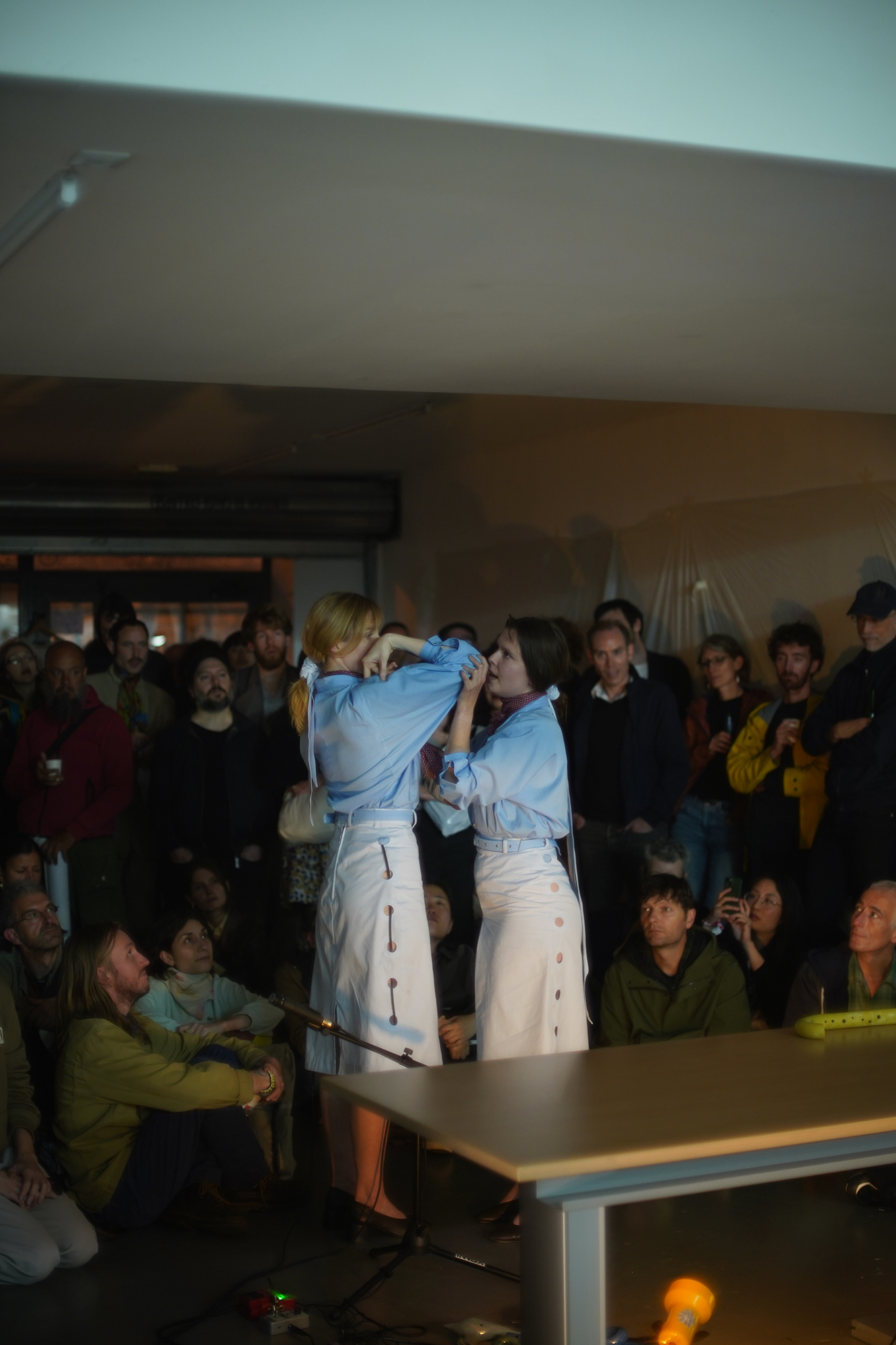 The shirt offers the possibility to talk into microphones that are placed on the elbow part. There is a contact switch on the shoulders that can be turned on with conductive tape located on the fingers.