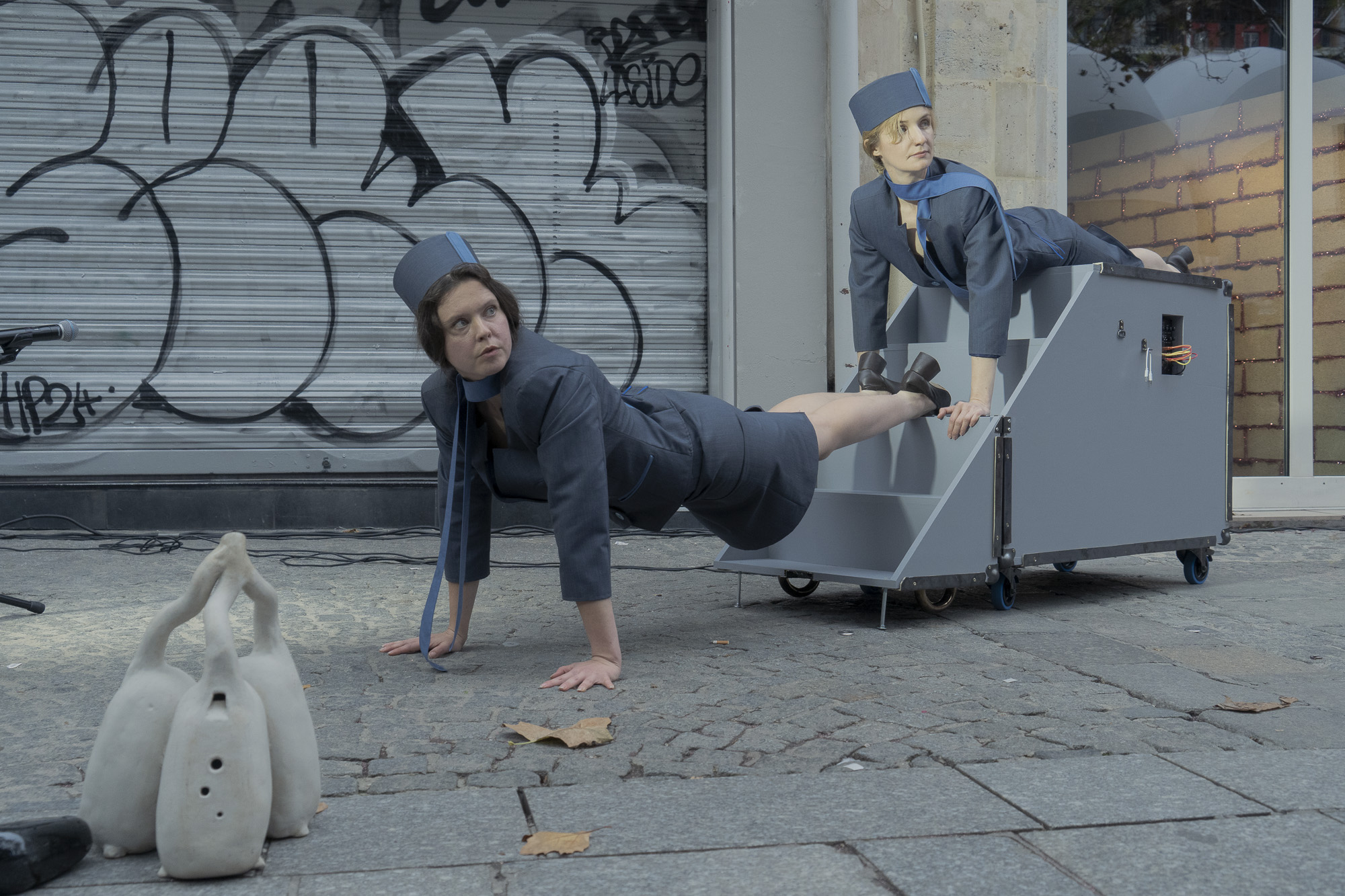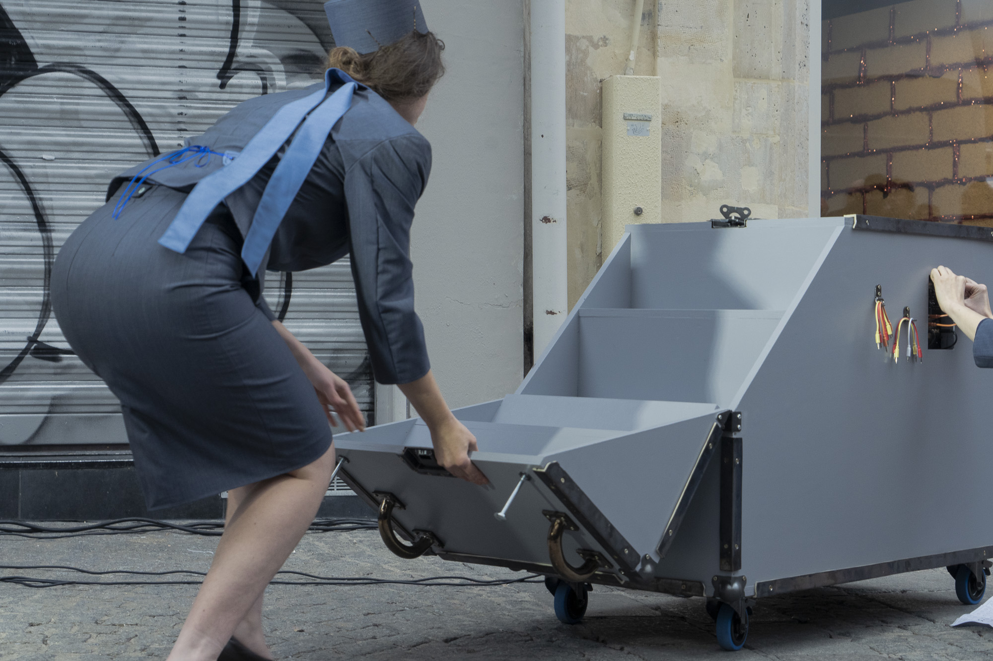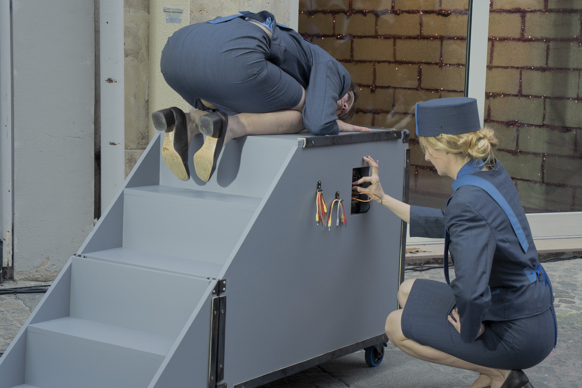 Flight Case is a performance centered around a transport cart, which air hostesses Elise Ehry and Kitty Maria will interact with. The cart, initially appearing as a closed case, is moved by the attendants before being transformed into a podium. This podium is made accessible by unfolding stairs. During the performance, the cart-podium will be connected to the sound system, transforming it into an electronic musical instrument.