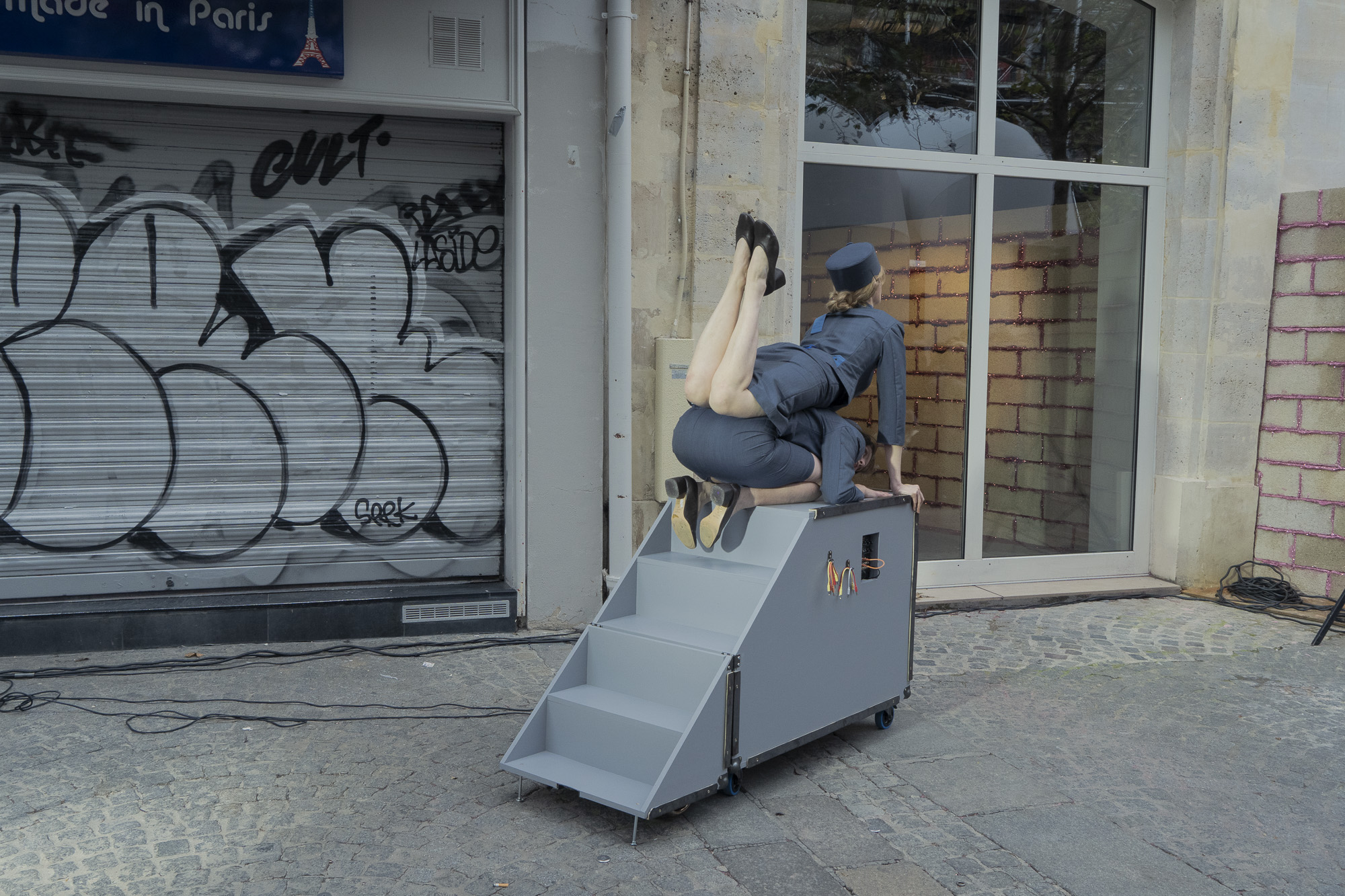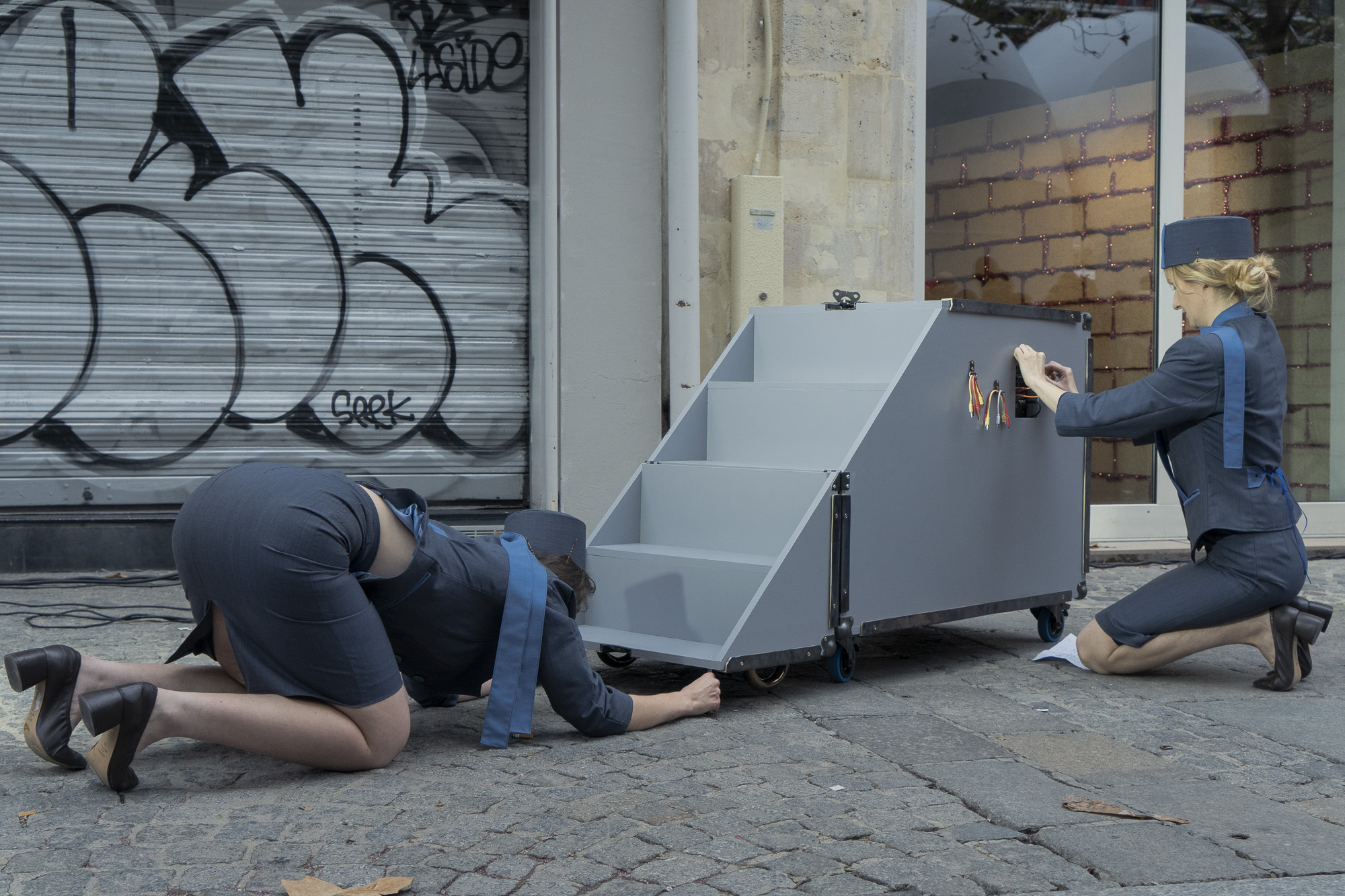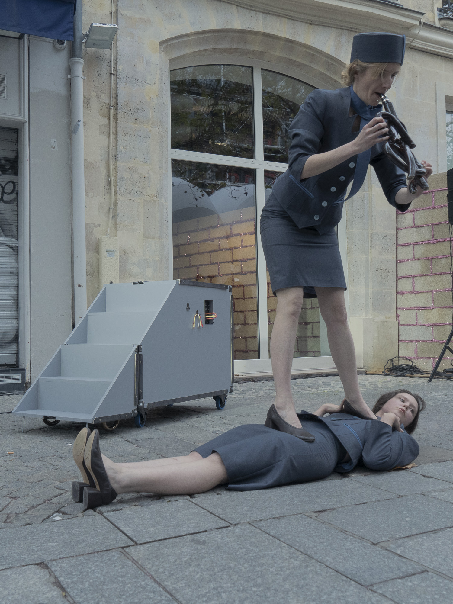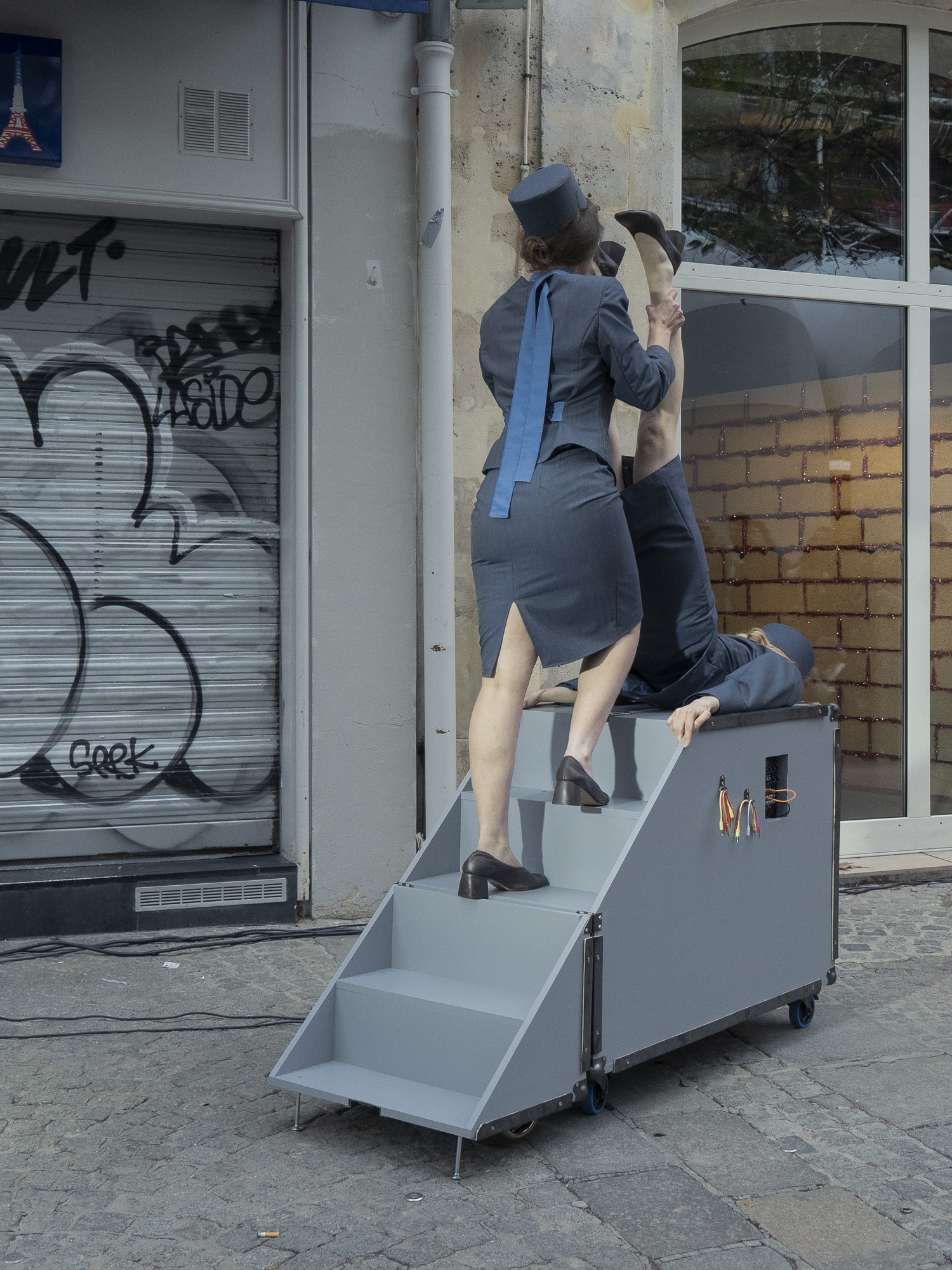 Flight Case is a performance centered around a transport cart, which air hostesses Elise Ehry and Kitty Maria will interact with. The cart, initially appearing as a closed case, is moved by the attendants before being transformed into a podium. This podium is made accessible by unfolding stairs. During the performance, the cart-podium will be connected to the sound system, transforming it into an electronic musical instrument.