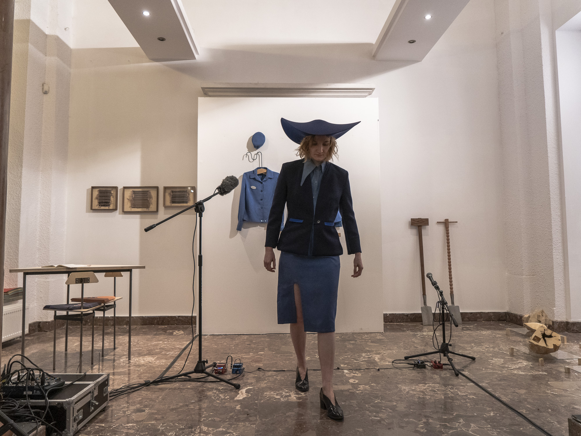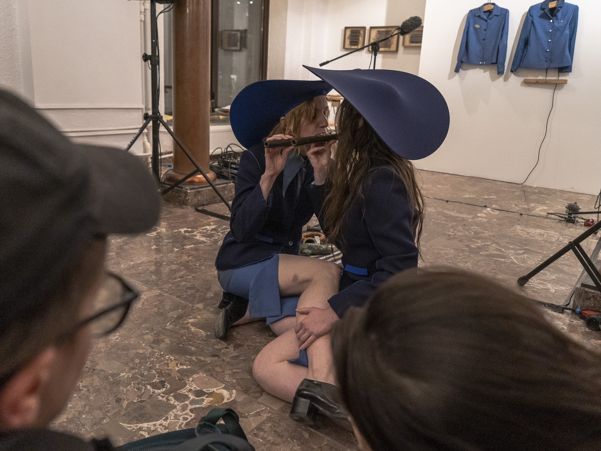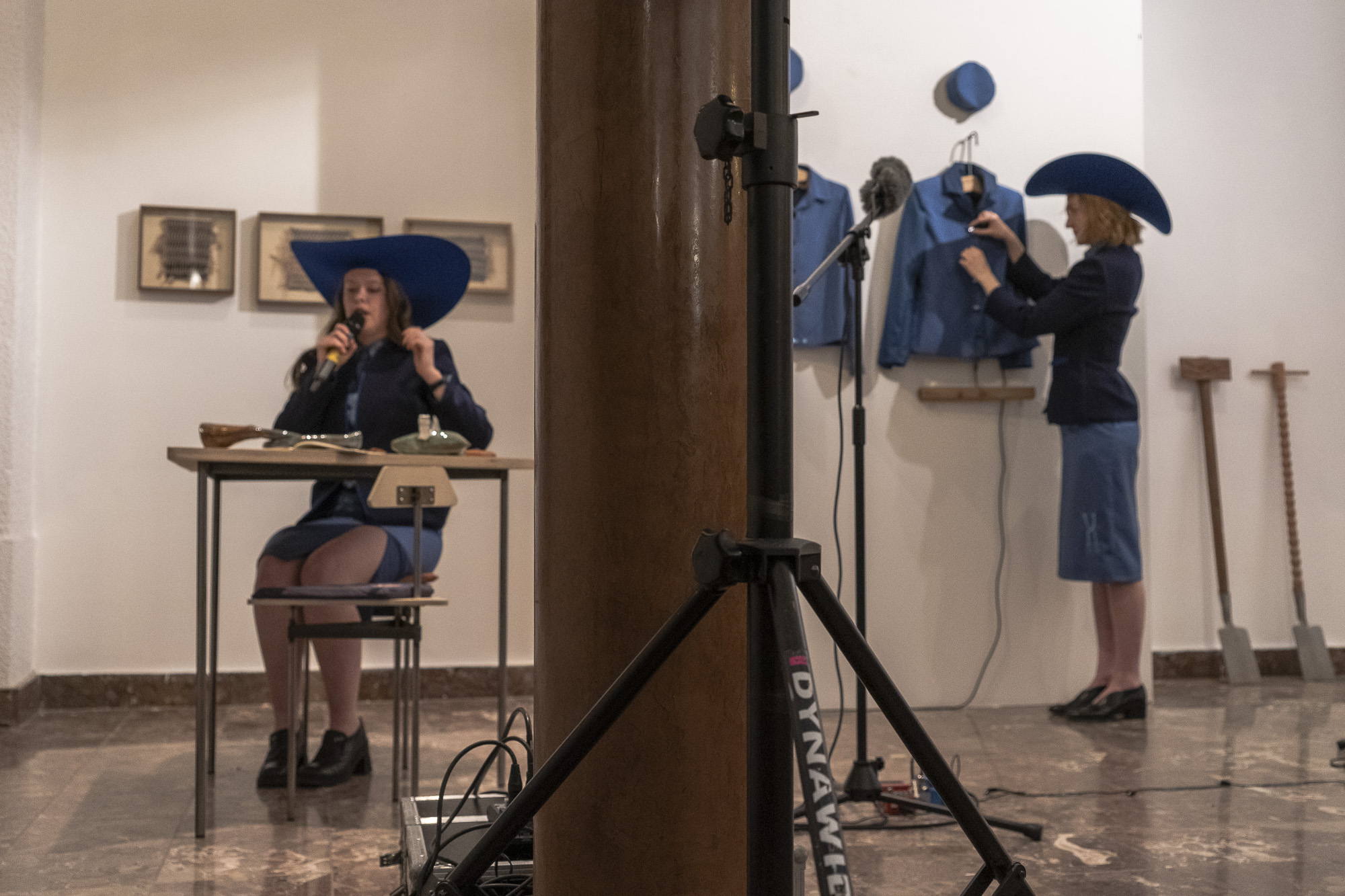 Kitty Maria and Elise Ehry join the Guild as unemployed air hostesses. Their services – which often involve injecting absurdity into concrete situations – are provided in the Public Relations Department. They become public spokespersons for the organization, amplifying the voices of physical laborers. In their performances, instead of increasing the rhythmic sound of tools, they make graceful noise.
